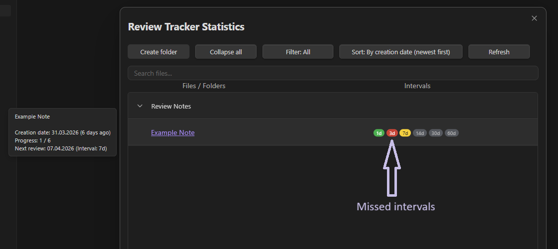 When this option is enabled, any interval whose scheduled review date is earlier than today and has not been marked as completed will be highlighted in red. This makes it easier to notice missed reviews and quickly identify notes that need attention.