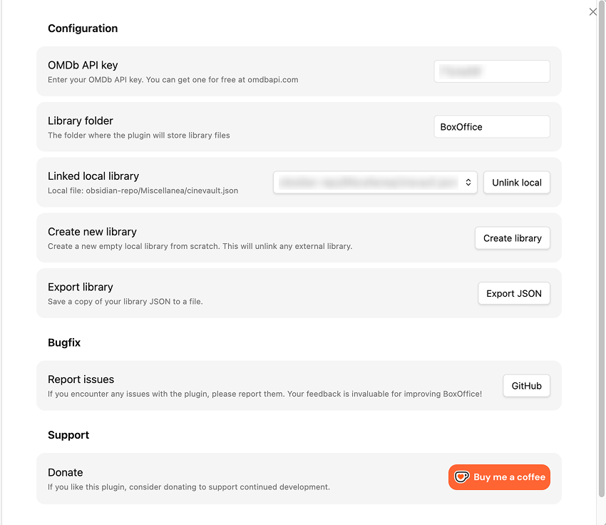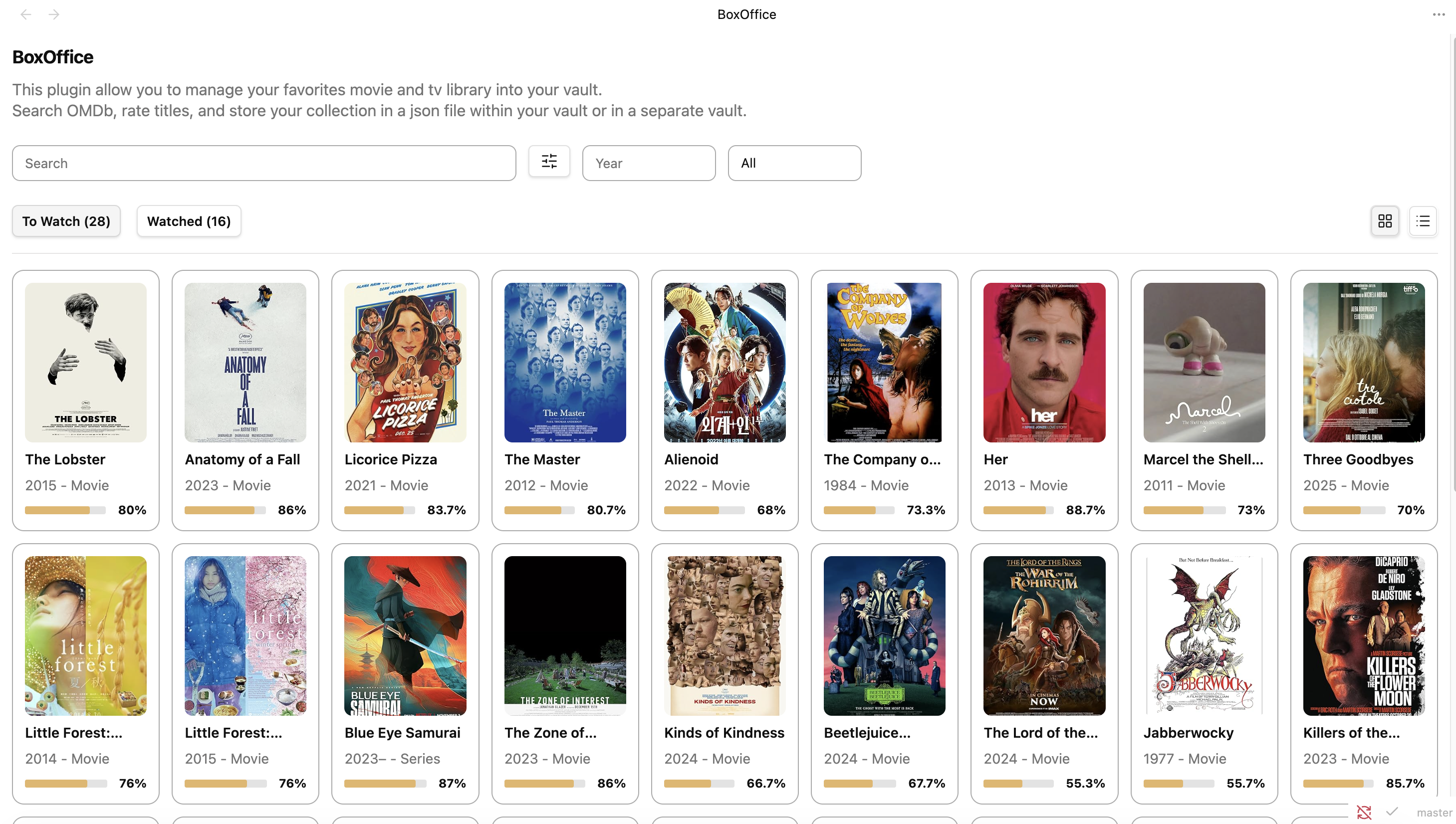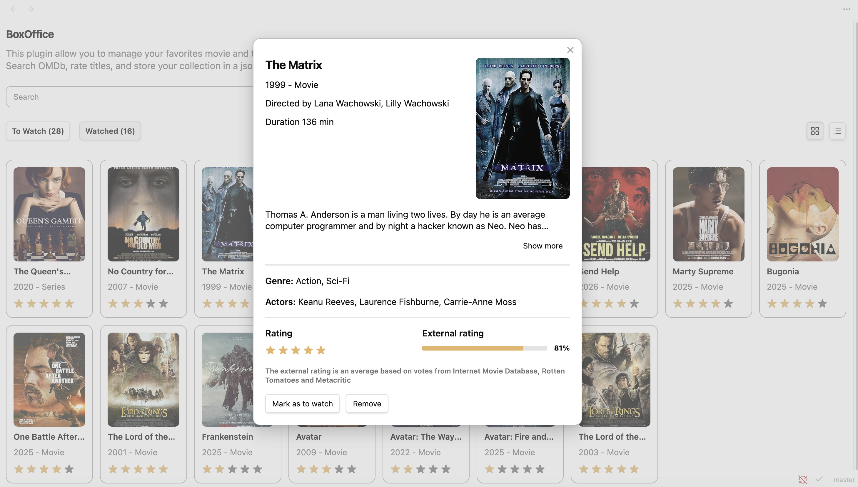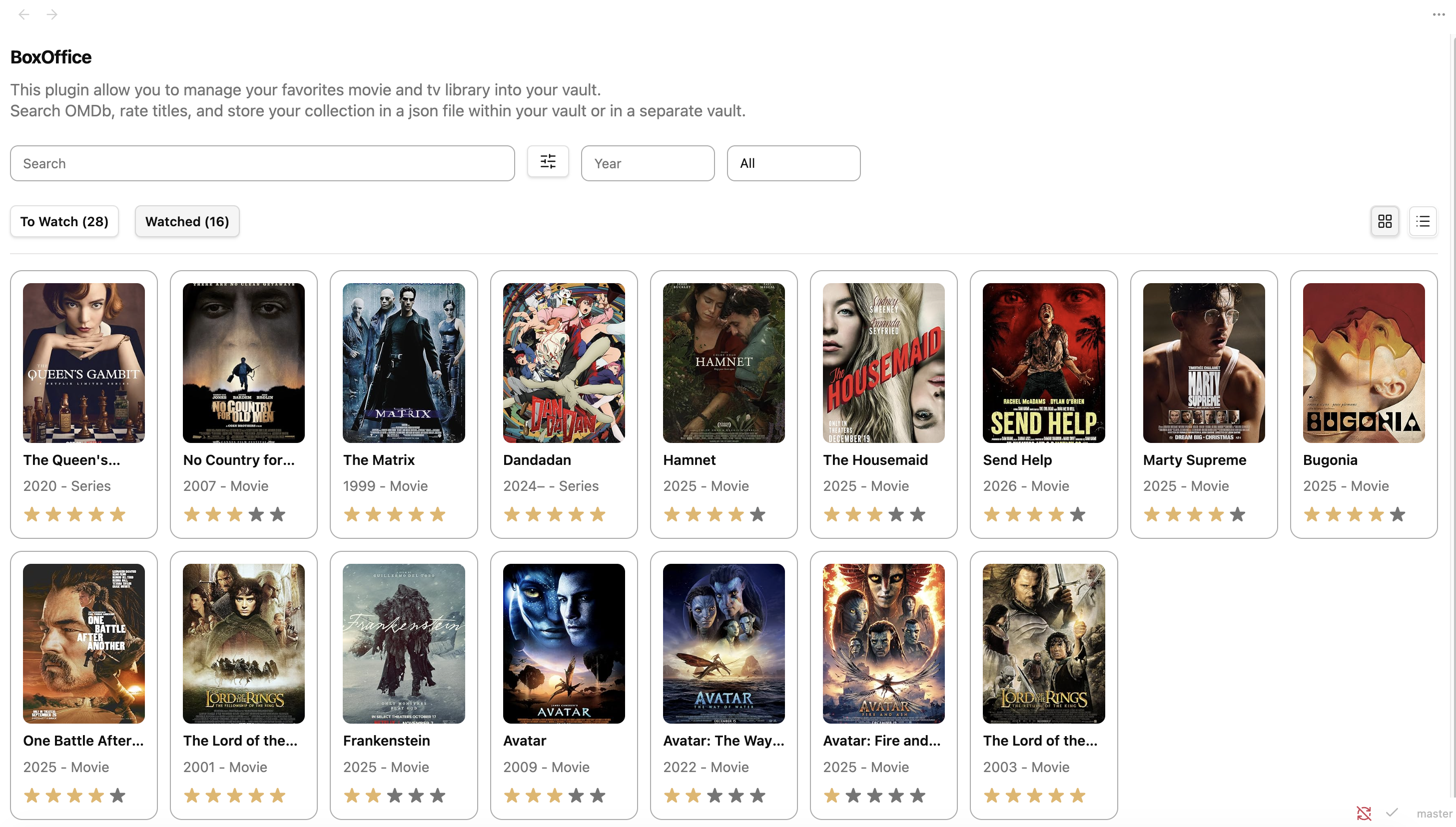 BoxOffice is an Obsidian plugin that turns your vault into a personal library for movies and TV shows. It allows searching data from OMDb, saving a local library as JSON, and managing watchlists and star ratings directly inside Obsidian.