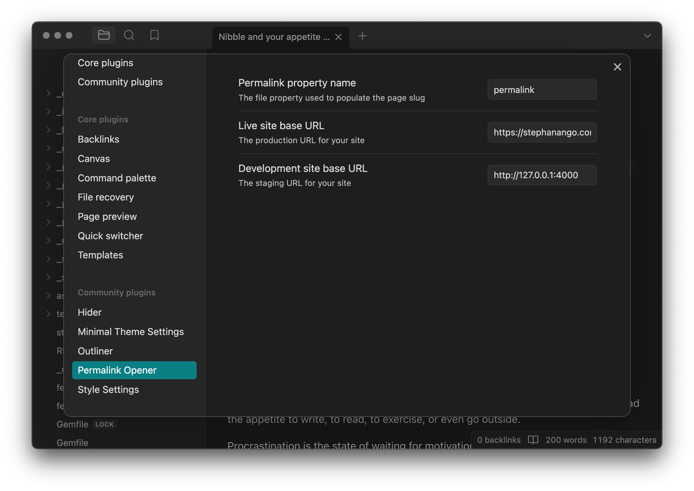 Open URLs based on a permalink or slug in the note properties. Useful with static site generator such as Jekyll, Hugo, Eleventy, etc.