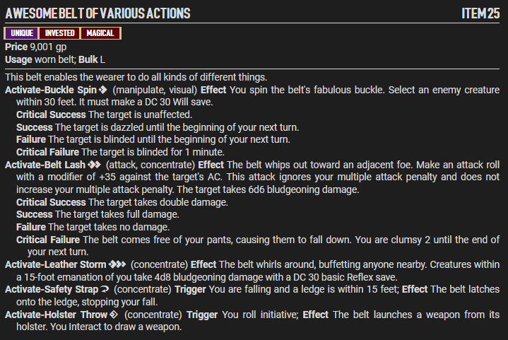 **Activate-Buckle Spin** `[one-action]` (manipulate, visual) **Effect** You spin the belt's fabulous buckle. Select an enemy creature within 30 feet. It must make a DC 30 Will save.