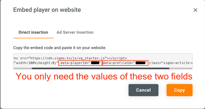 In the viqeo_profile_id field, enter the profile ID from the embed code, data-profileId field.