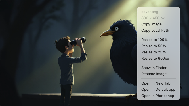 Pixel perfect 100% image resizing, copy to clipboard, show image in Finder/Explorer, edit image in external editor, and much more.