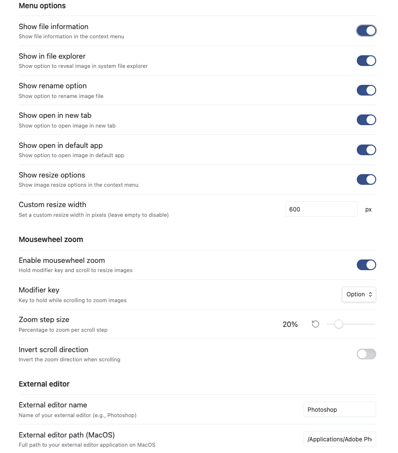 - Configure path to external image editor (platform-specific for macOS, Windows, and Linux)