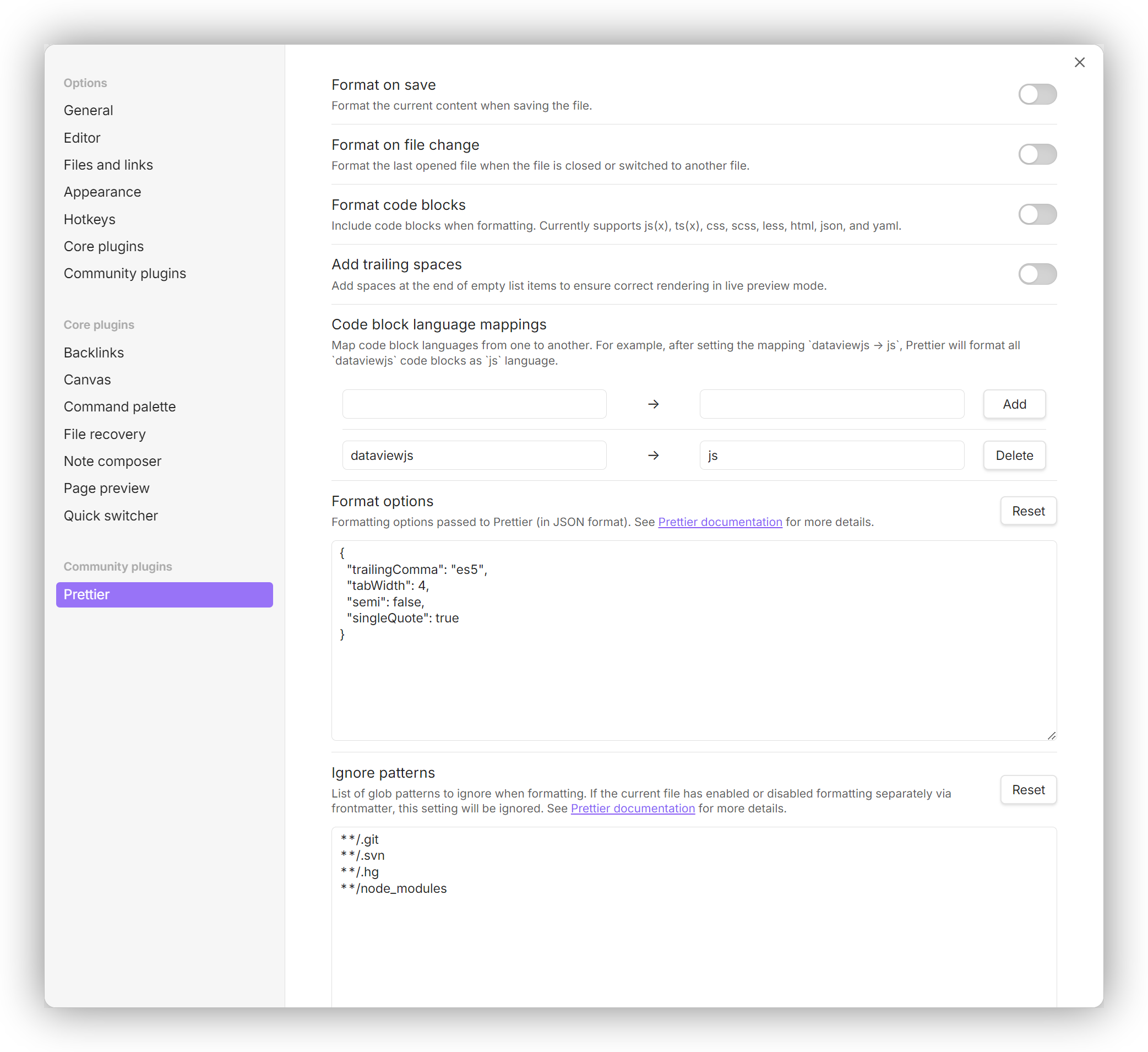 dataviewjs → js, Prettier will format alldataviewjscode blocks asjslanguage. -