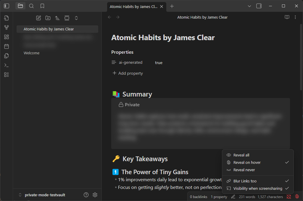 Simple #private mode for Obsidian. All files, links and search results tagged with #private will get blurred out in the default mode. You have to either hover over or focus on the element to show it temporarily or use the command "Reveal all" to always show it.