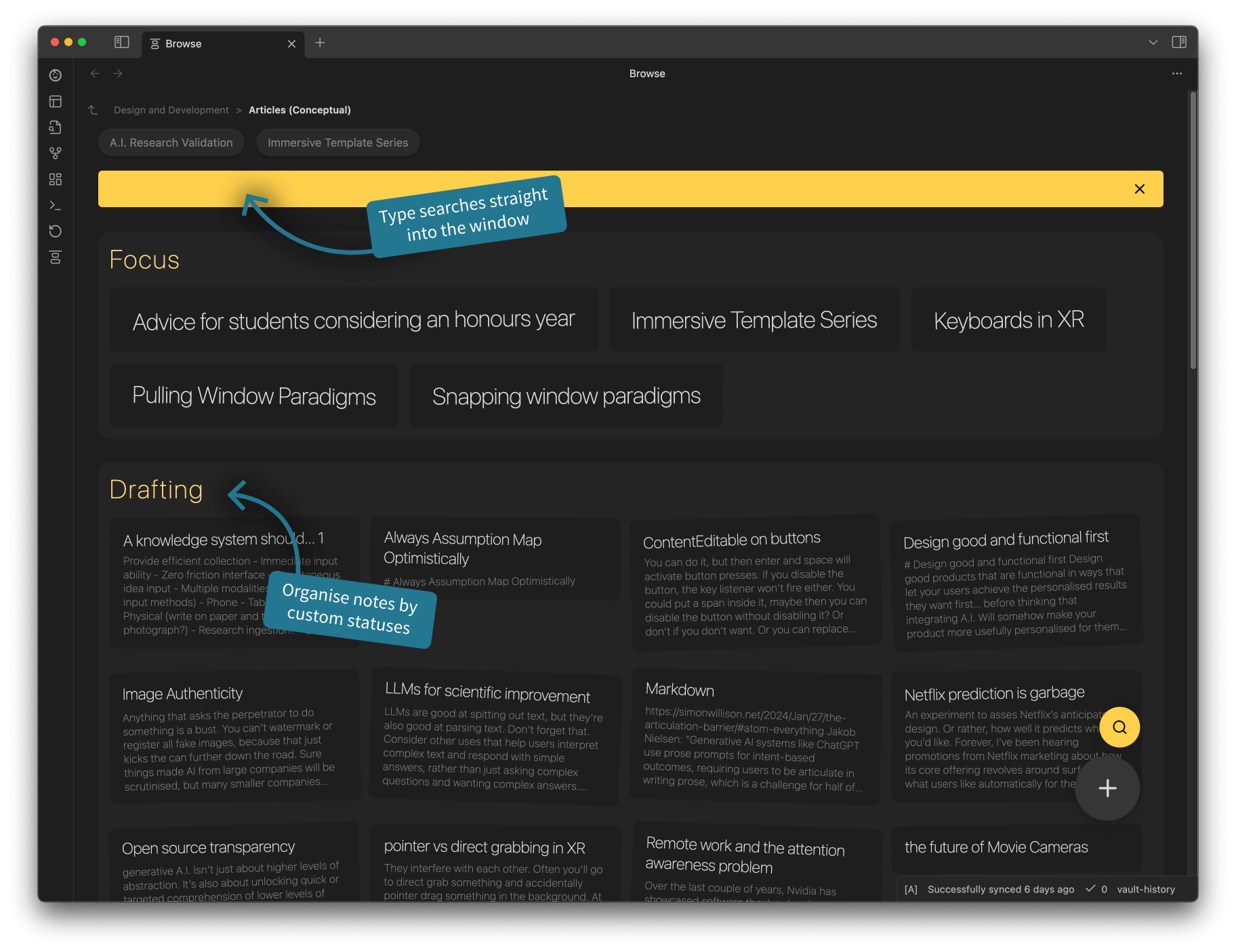 A plugin for Obsidian that replaces your new tab window with a card layout of the files in each folder organised by state. The view is filterable with an inbuilt search field (just start typing!), and files can be assigned a state from a prominent menu within the note.
