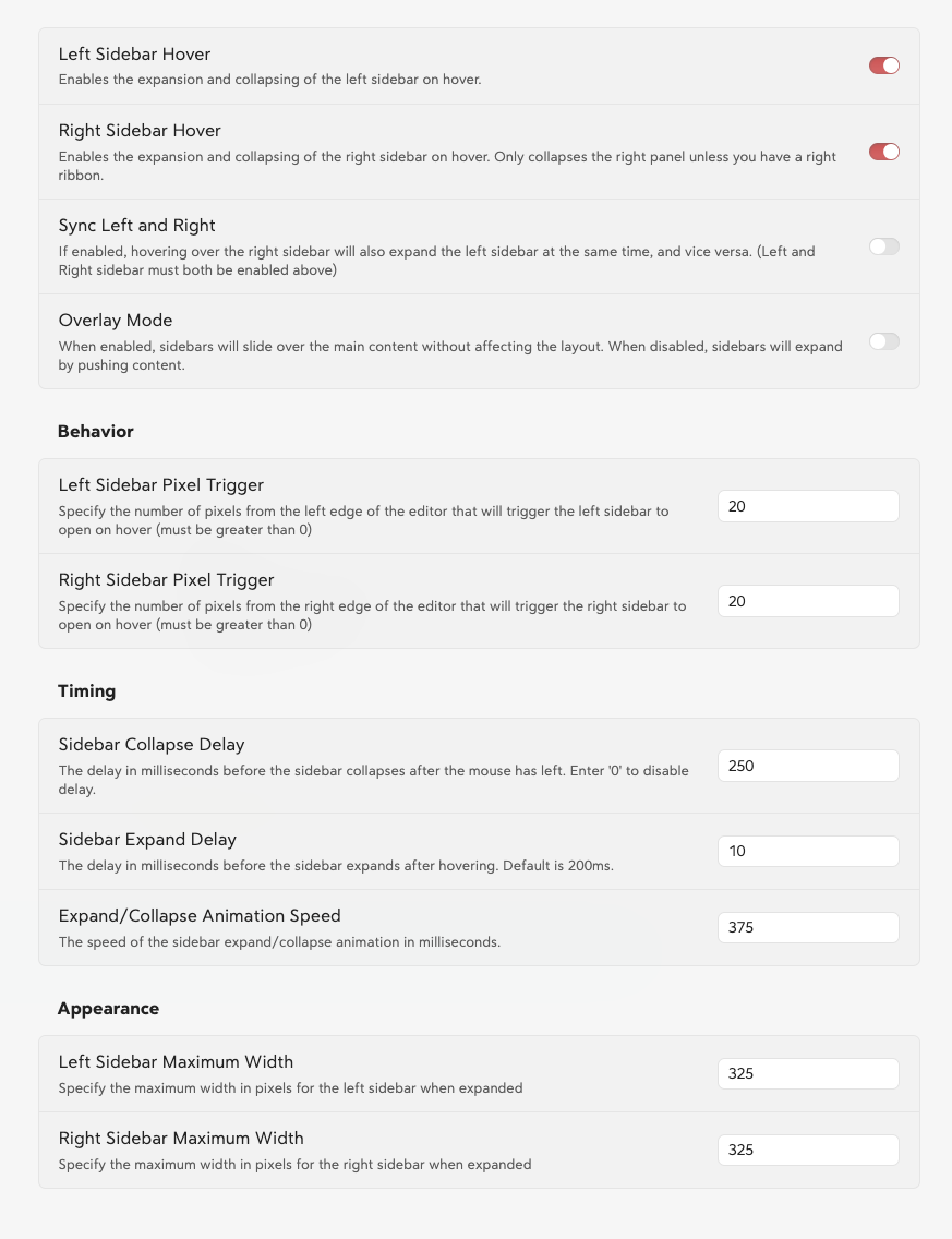 | Sync Left and Right | Expands both sidebars simultaneously when one is hovered (requires both to be enabled). | Disabled |