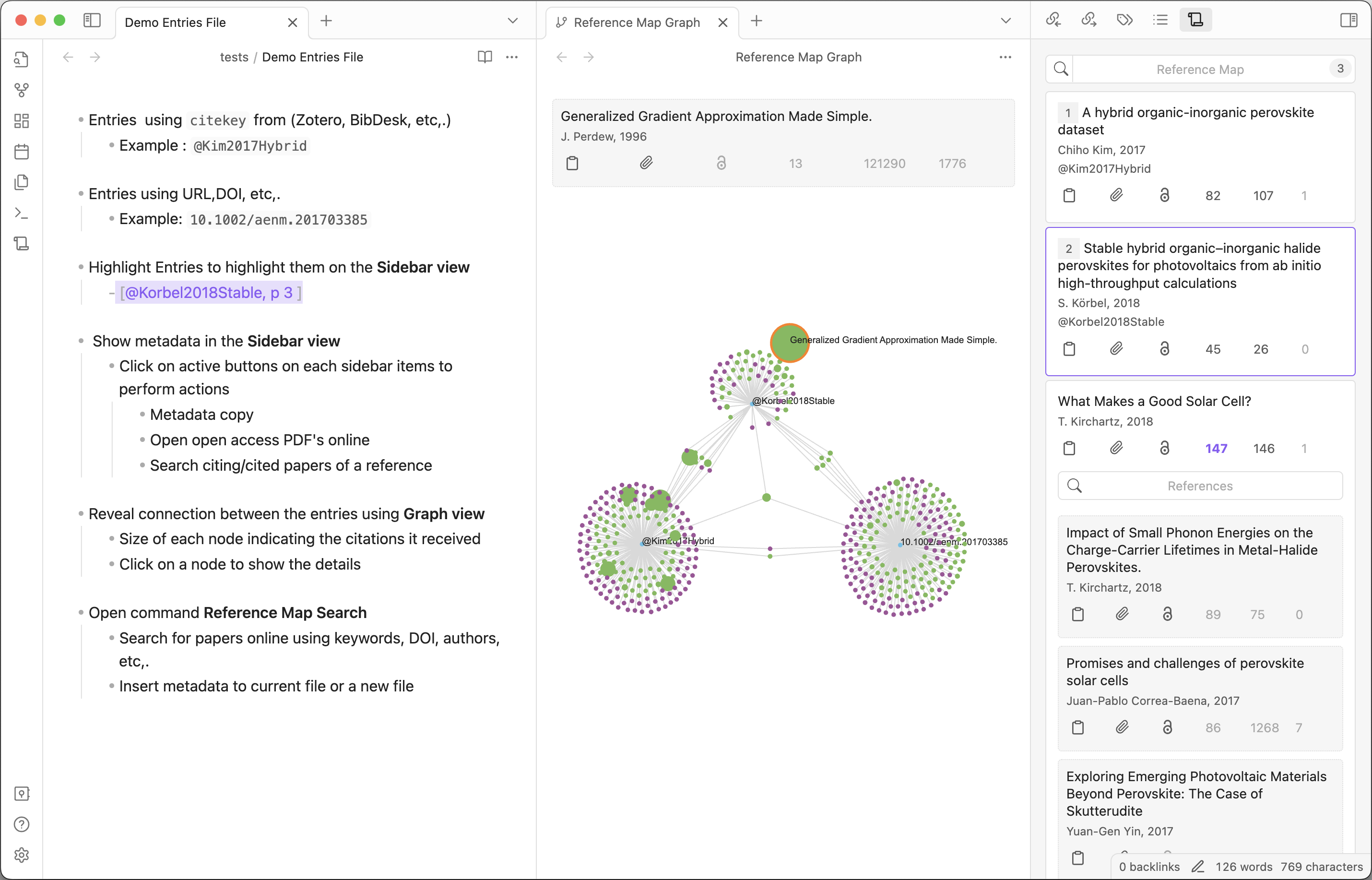 Open command palette and run Reference Map: Open Literature Graph to open the graph view. Reveal connection between the entries. Size of each node indicating the citations it received