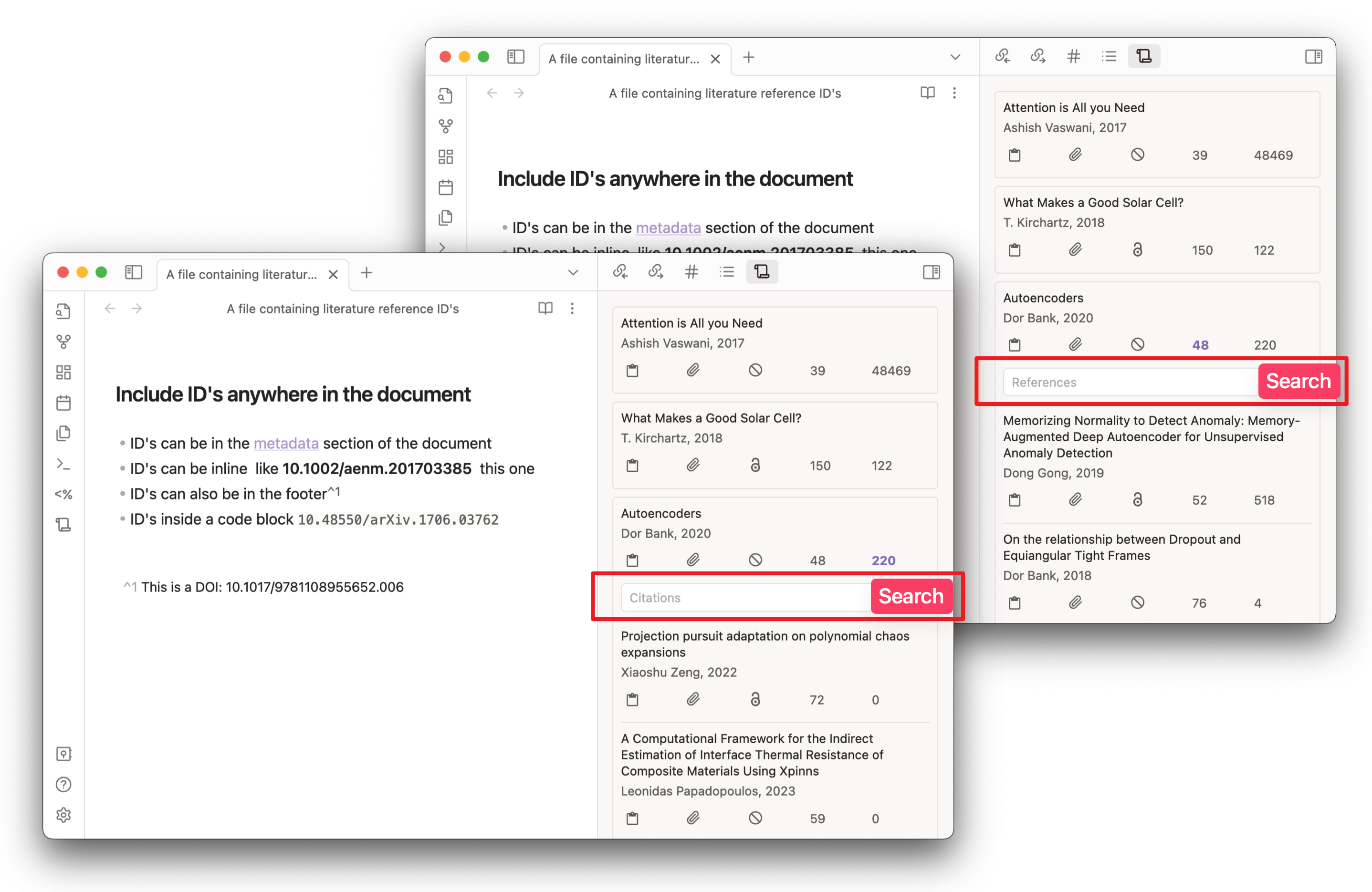 Reference IDs (DOI, arxiv, corpusID, URL, citeKey, etc,.) that are found in the current document are listed in the Reference Map view. Valid IDs can be added anywhere in the document and they will be detected.