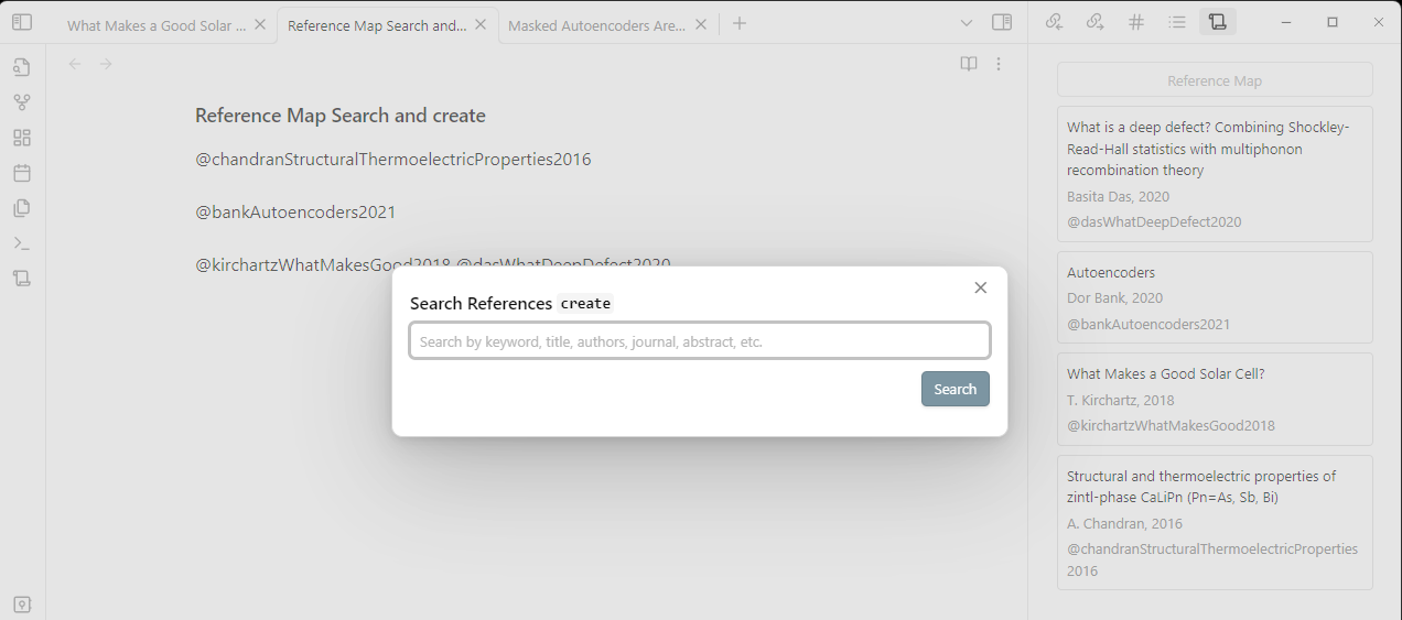 | Reference Map: Search and Create | Search for references online to create a new markdown file using the details | - |