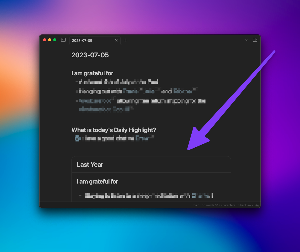 When this plugin is enabled, it will show past daily or weekly notes from the associated daily/weekly note. For example, if you have a daily note from 2023-07-01 it will show you the daily note from 2022-07-01 as well as previous years (if there are any). While lookling at weekly notes, it will show you weekly notes from previous years with the same week number.