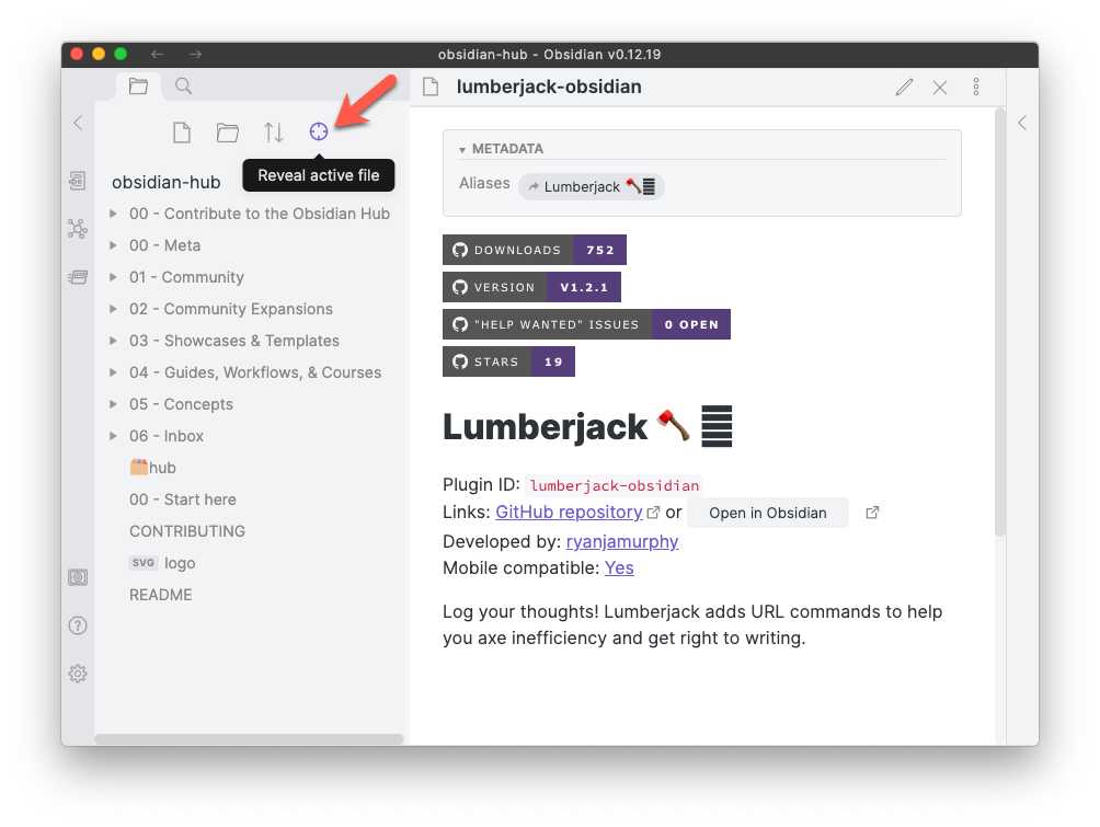 Reveal Active File Button is an Obsidian plugin that adds a single-click button to make the Obsidian.md File Explorer/Navigator show your active file, for example to find neighbouring files.