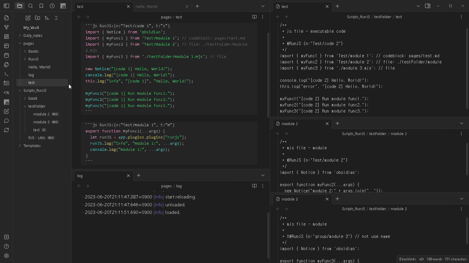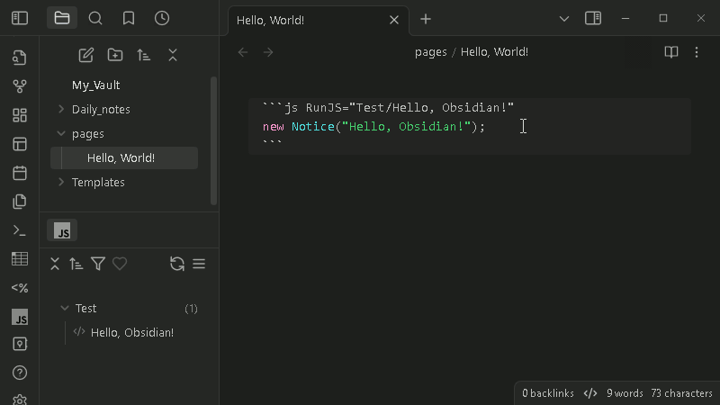 RunJS is a plugin for running JavaScript code in Obsidian. You can directly run trivial(?) code snippets without having to create a separate plugin. But, like any other plugin, you can run code that manages Obsidian and notes. Codes is written as codeblocks (.md) in Obsidian Notes or as separate files (.js, .mjs). You also have the option to break down your code into executable code and module to give you better organization.