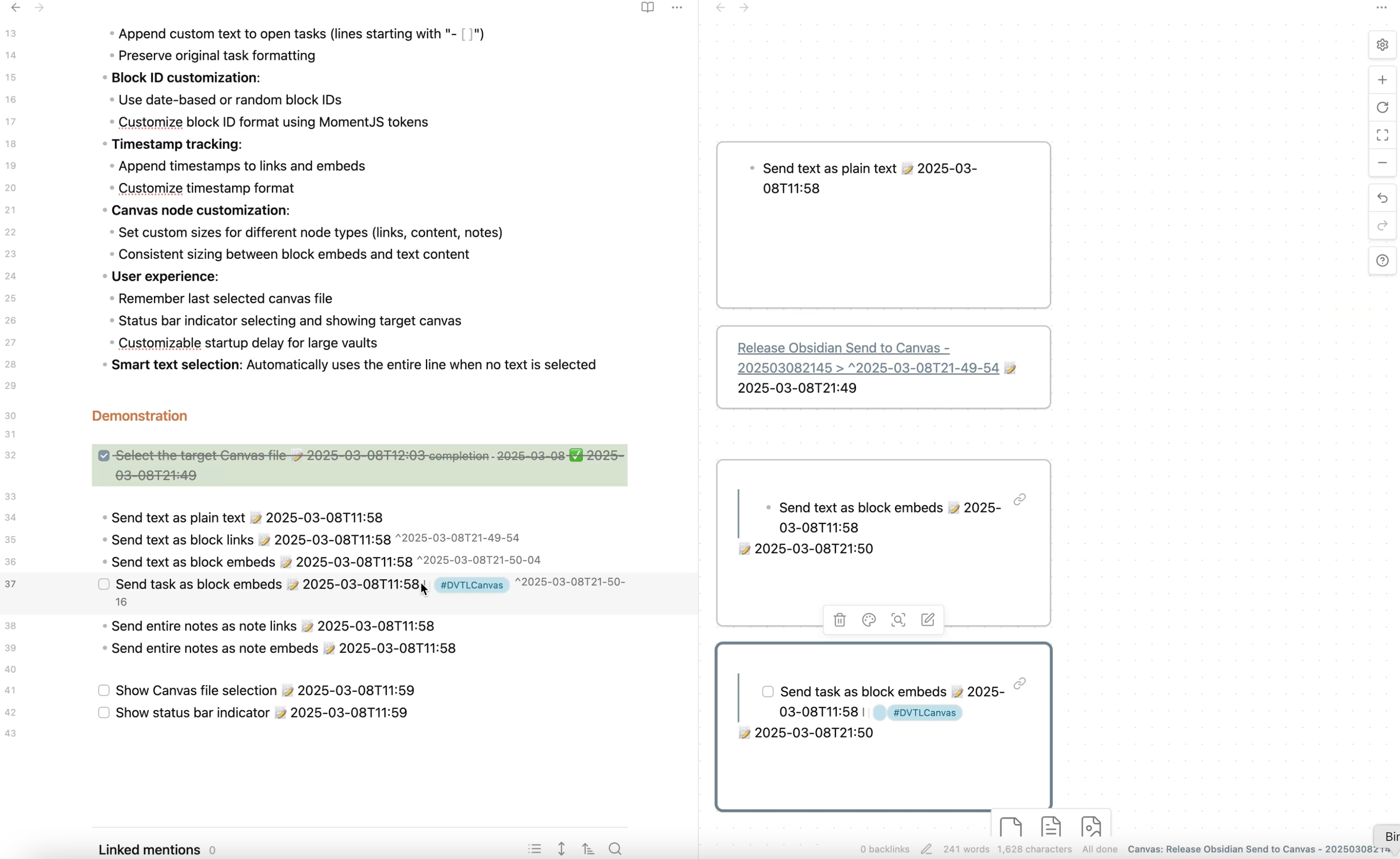 An Obsidian plugin that allows you to send tasks, blocks, and notes to Canvas files as plain text, links, and embeds.