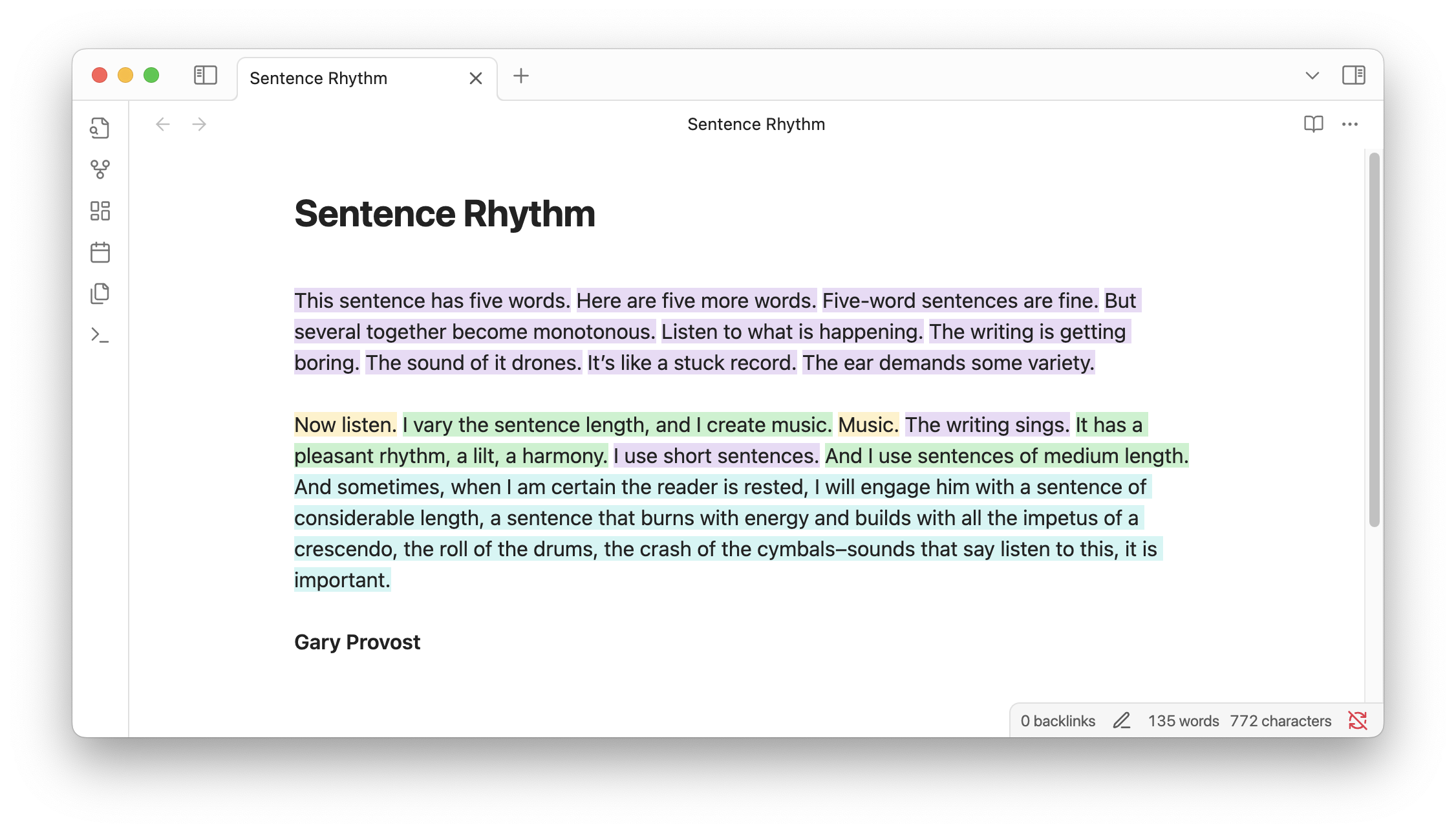 Inspired by Gary Provost's advice on varying sentence length, this plugin toggle colored highlights on and off to quickly see sentence length variety in your writing.