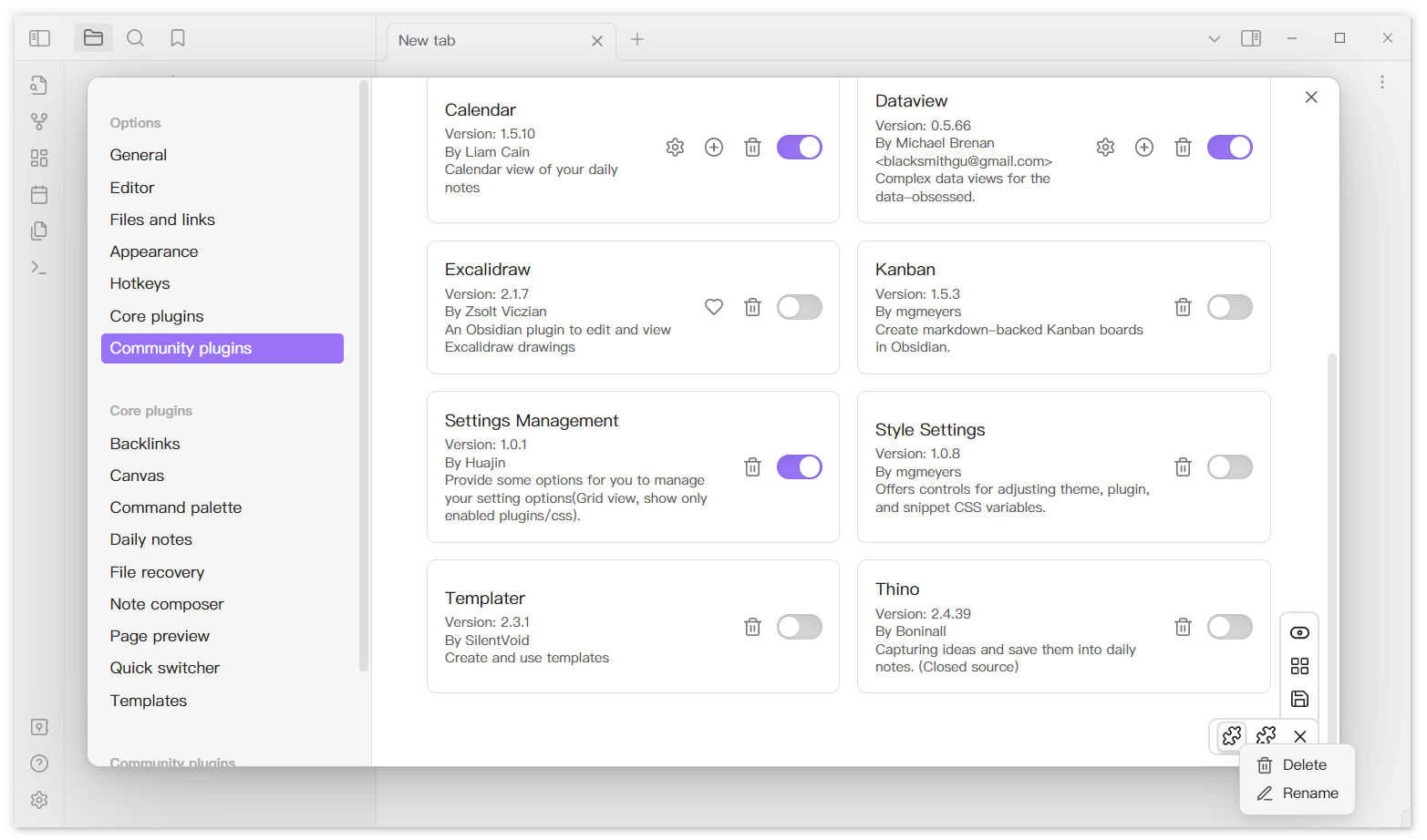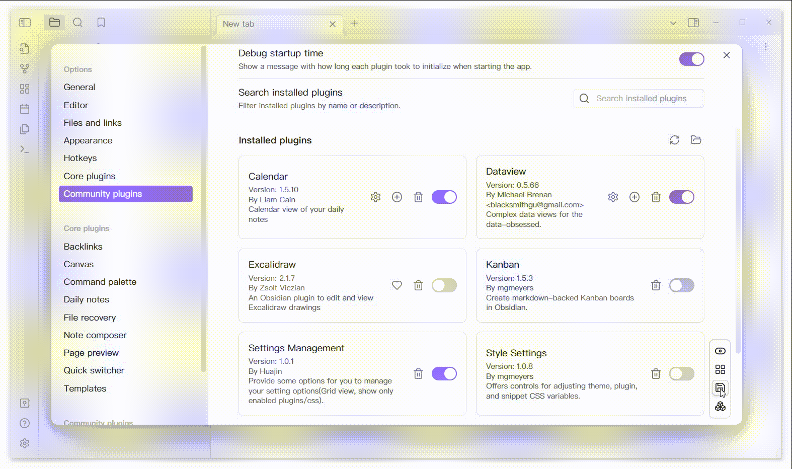 Manage settings options, including show enabled/disabled plugins and css, grid layout, save current plugins/css enable config for quick enable/disable, etc.
