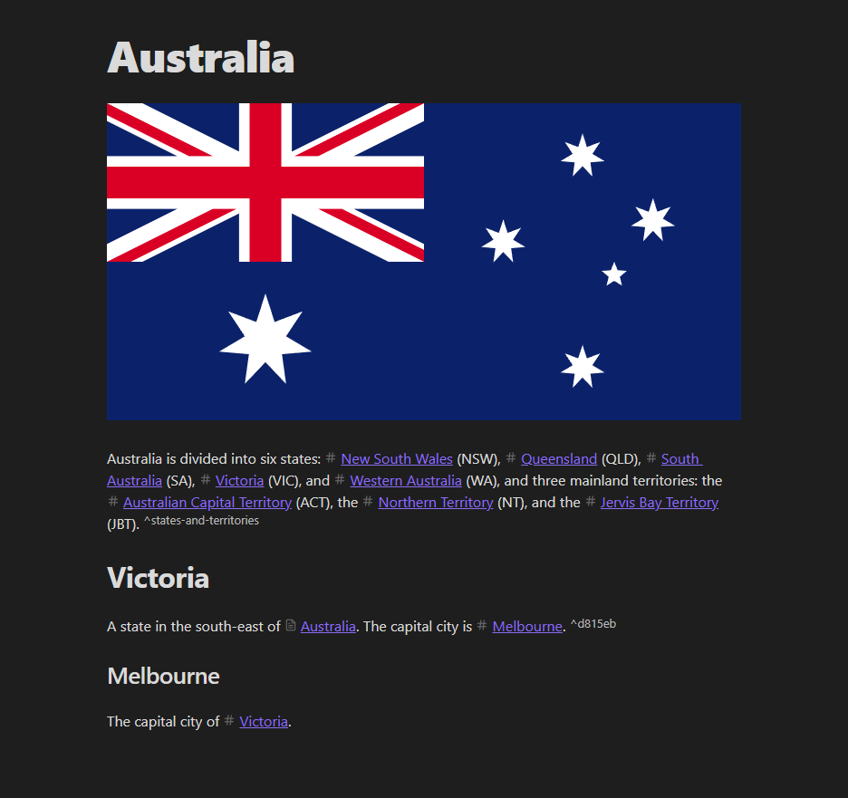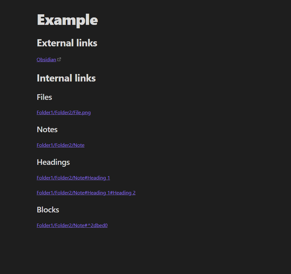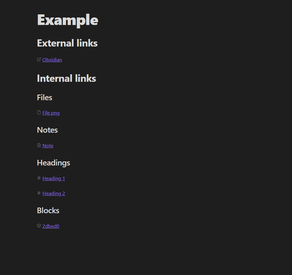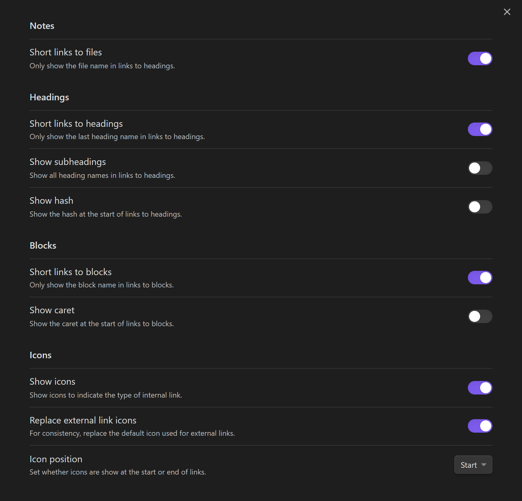 Internal links to files, notes, headings, and blocks can be shortened. There are various configuration options to adjust how this is applied. In addition, icons can be displayed at the start or end of links to indicate their type.