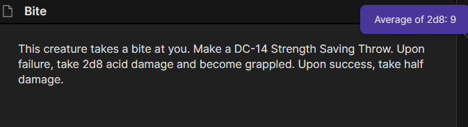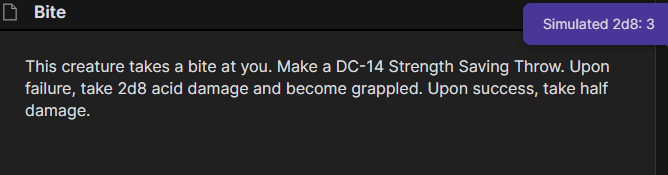 dfollowed by another number, and an optional+. There can be any number of dice. That is 1d10+2d6+4 is a valid formula, and will be calculated as a single formula. - If there are no dice, the plugin will simply exit, providing an appropriate alert error.