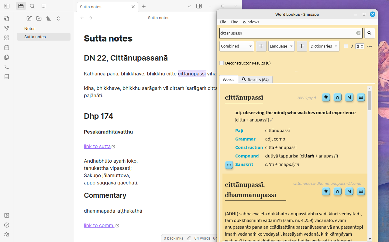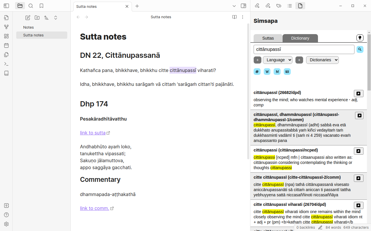 Pāli dictionary and sutta search using Simsapa Dhamma Reader. Open a sidebar or double-click to lookup Pāli words in the dictionary, or search in the suttas.