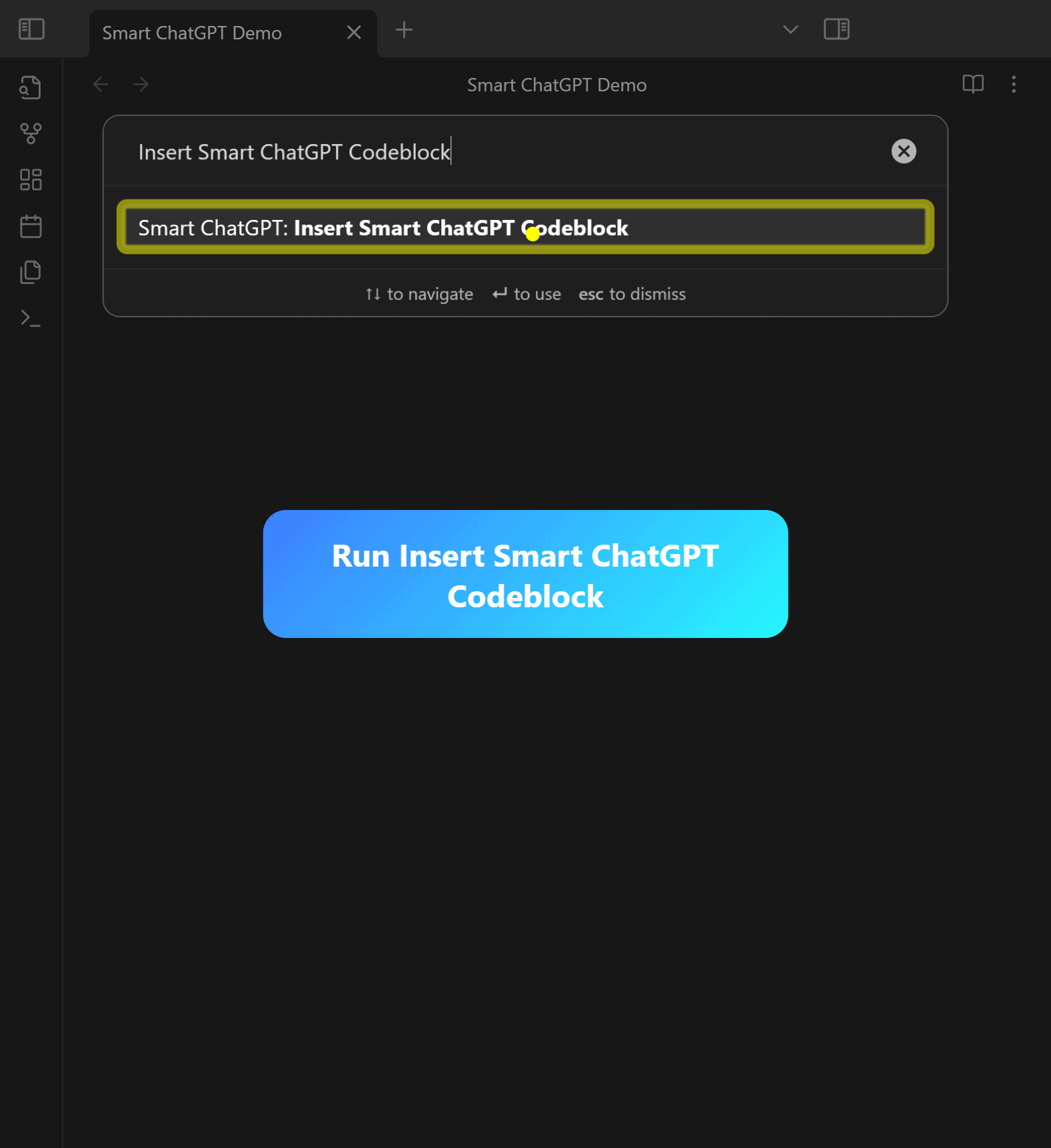 - Run a command like Insert OpenAI ChatGPT codeblock from the command palette.