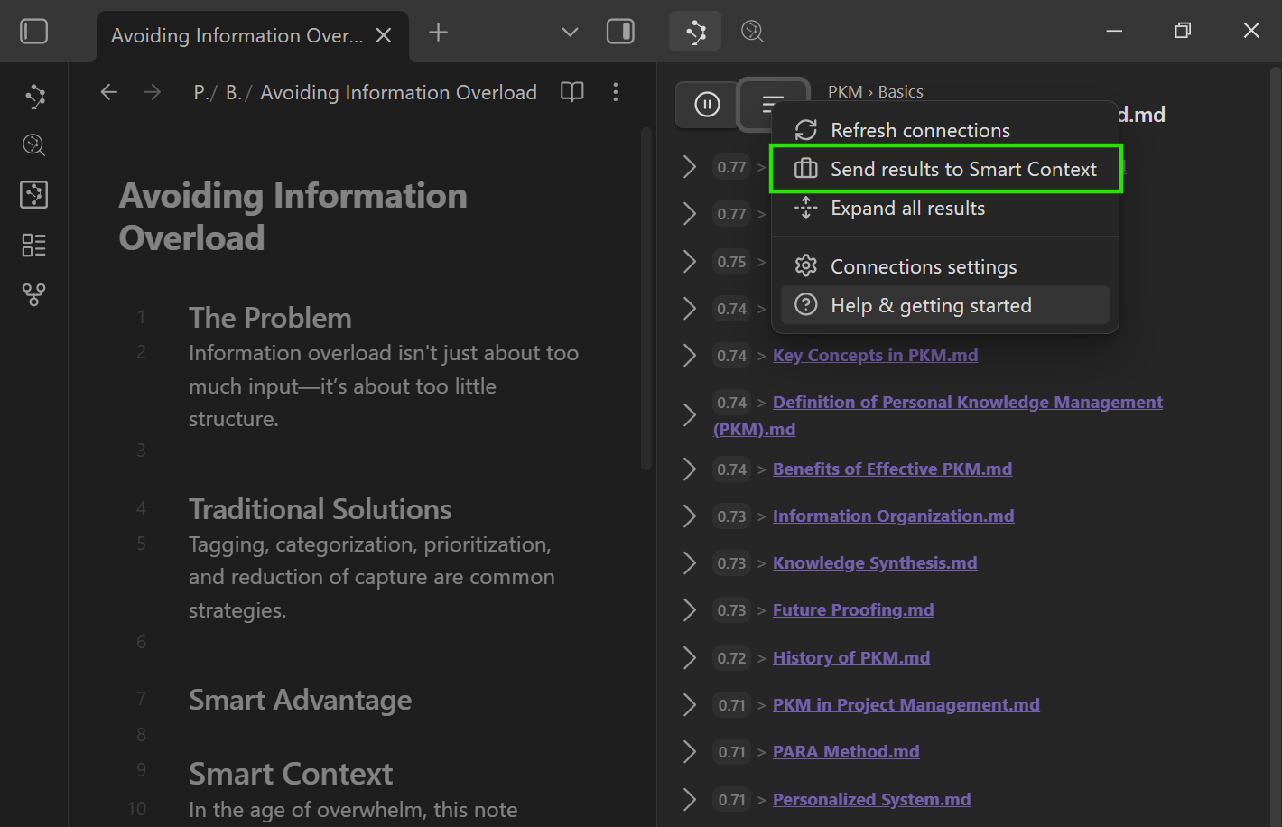 [!NOTE] Why does context matter? AI only answers as well as the context you provide. Smart Context helps aggregate scattered notes into templated snippets that can be quickly pasted into ChatGPT, so your prompts hit harder, your responses feel clairvoyant, and your flow state stays unbroken.