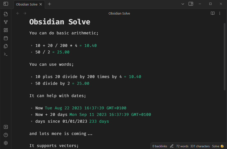 An unobtrusive Obsidian plugin that quietly processes equations and patterns in real time, inspired by NoteMaster's Smart Mode. With solid engineering at its core, Solve enhances note-taking without relying on ChatGPT. For instance, effortlessly calculates date expressions (e.g., 'Now + 20 days'), performs arithmetic (e.g., '10 + 5'), and more features are coming soon.