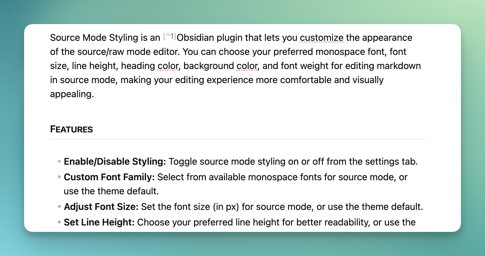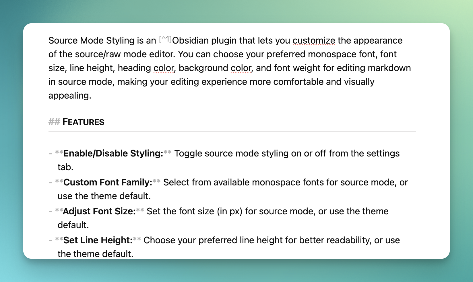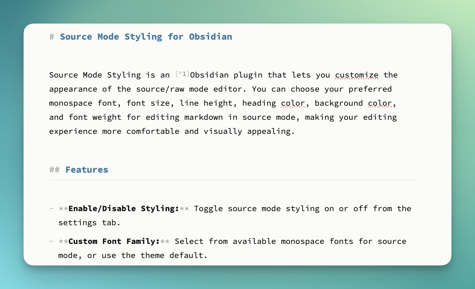 Source Mode Styling enhances Obsidian's source mode editor by applying monospace fonts and customizable styling that's familiar to developers and text editor users. While Obsidian's default source mode shows markdown syntax but retains most visual formatting, this plugin gives you an authentic "raw" editing experience providing greater differentiation with the Live Preview editor mode.