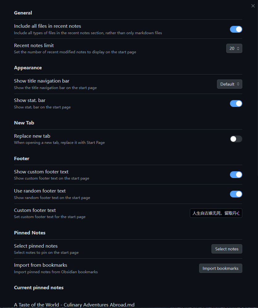 Automatically opens a customized homepage upon startup, displaying pinned and recent notes.
