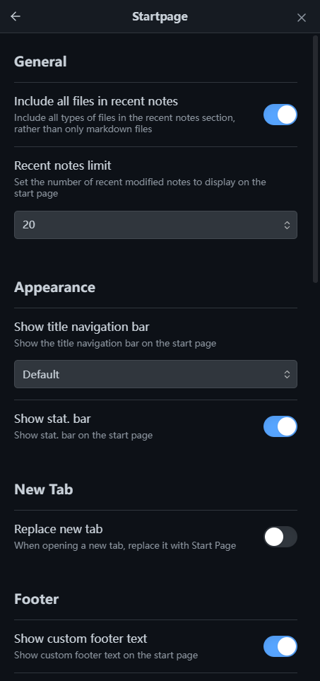 - Enable the "Startpage" plugin in Settings → Community plugins.