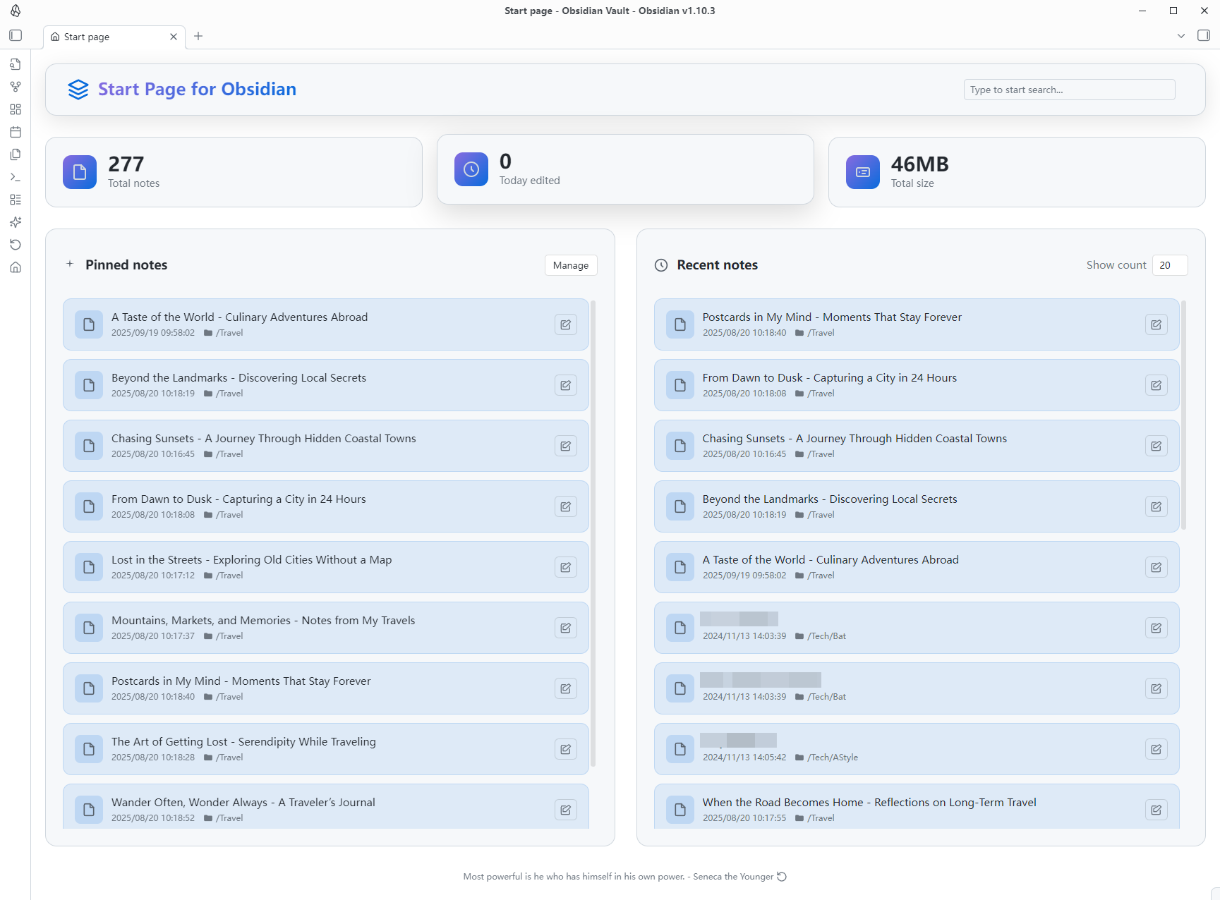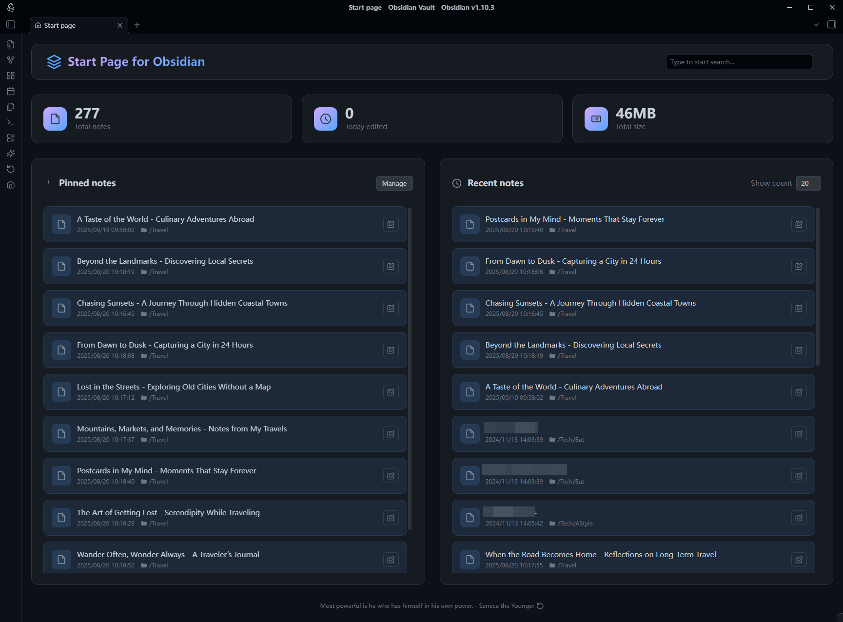 A modern startup homepage plugin for Obsidian that provides a beautiful dashboard interface, displaying vault statistics, pinned notes, and recently modified notes. Automatically displays a personalized homepage when starting Obsidian or opening new tabs, giving you quick access to important content.