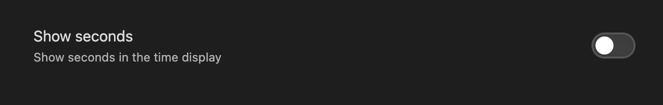 One option (for now) - toggle showing the seconds in the clock. With this turned off, the clock will show the hour: minutes AM/PM. With this turned on this the clock will update every second and show hour : minutes : seconds AM/PM.