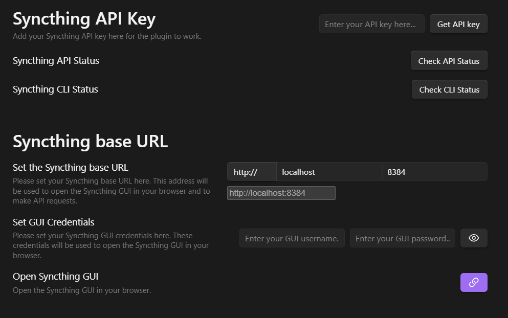 The plugin's configuration provides a way to set up the connection to your Syncthing instance. On Desktop, it should be straightforward if you have the CLI installed. Otherwise, you can use the GUI to set up the connection.