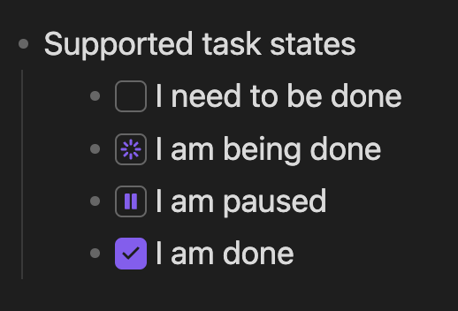 Markdown compatability, task-list extends markdown but doesn't break it, your documents will still render outside of this plugin, with a readable task state and easy to remember directives