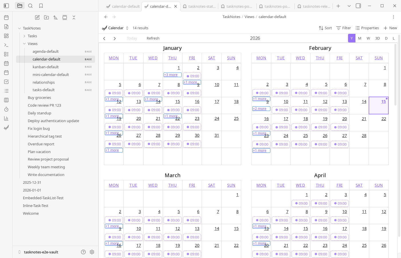 TaskNotes registers as a Bases data source and provides custom view types: tasknotesTaskList, tasknotesKanban, tasknotesCalendar, and tasknotesMiniCalendar. The default Agenda file is a preconfigured tasknotesCalendar list view (listWeek). Your task notes become rows; frontmatter properties become columns.