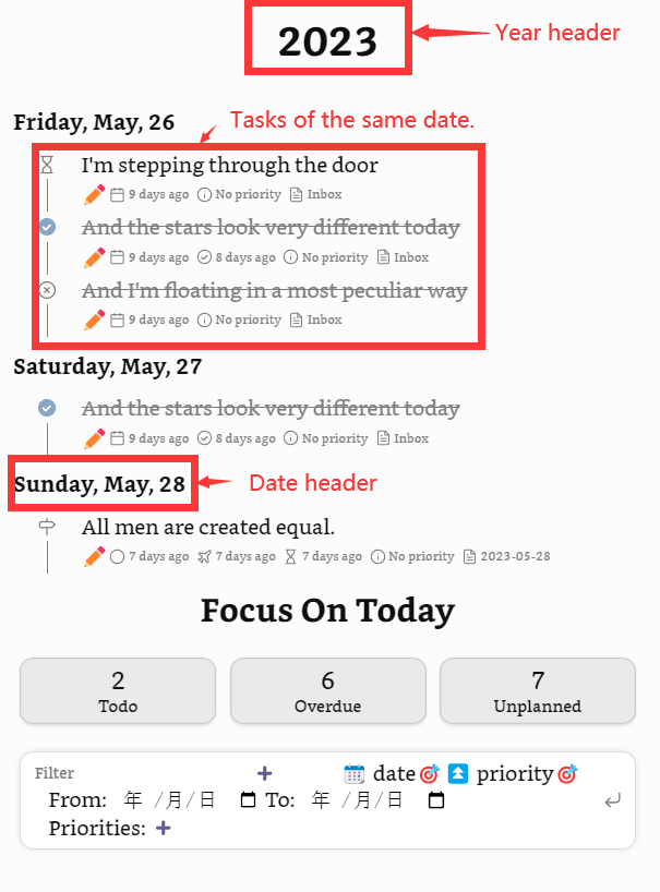 The content component are date-based, to be specific, the task items are organized with their dates. For each date, there could be a date header, and there could be a year head for each year.