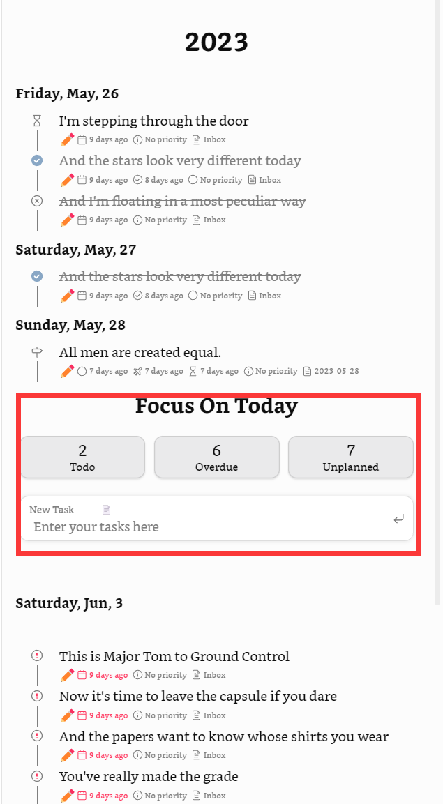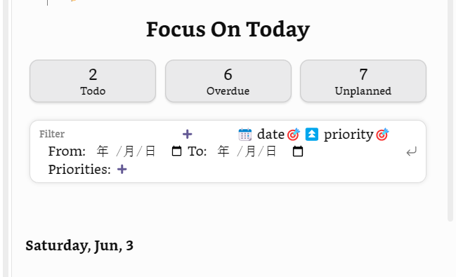 Another functionality the input line provides is a quick filter, currently data range and priorities based filter are supported, hopefully a tag based filter will be added soon!