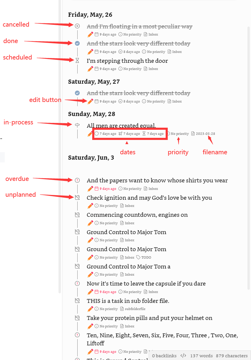 For a specific task item, this view displays the item content, status, priority, dates, filename and section (if exists), and the tags. Plus there is a button with a pencil icon to call the task edit modal of the Tasks Plugin out for editing.