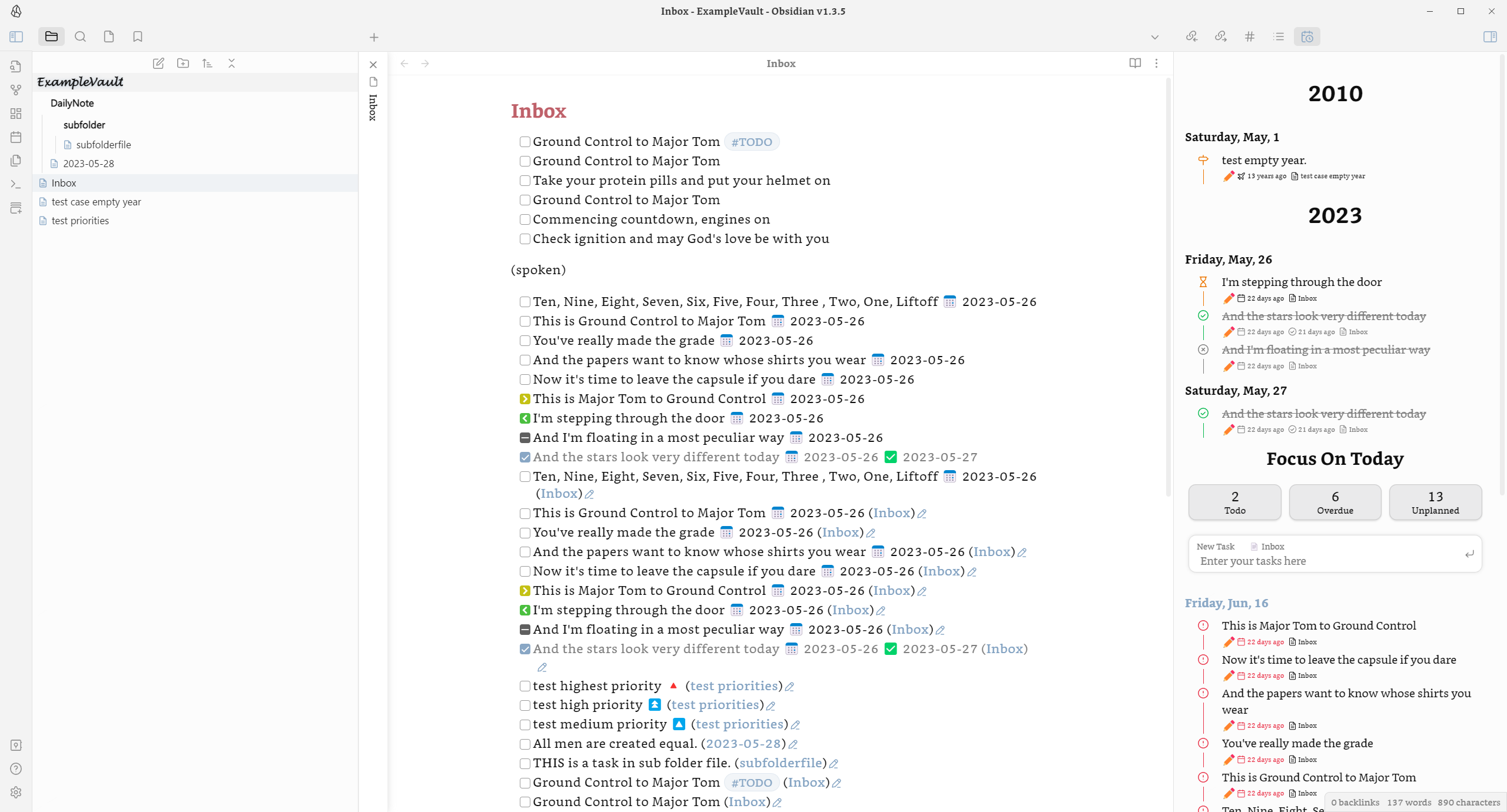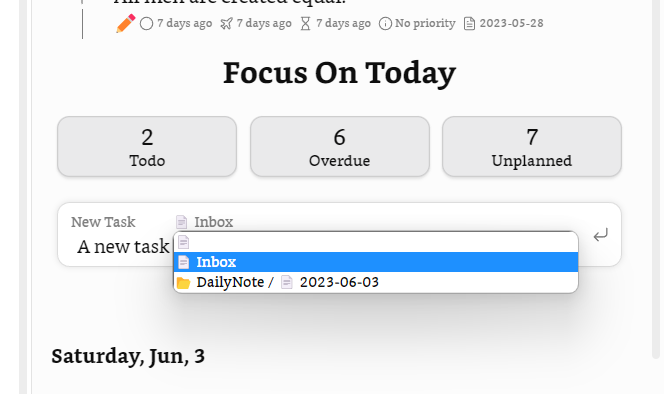 - Inbox: Set a filename to be your 'Inbox', you can quickly append new tasks to it from the quick entry panel.
