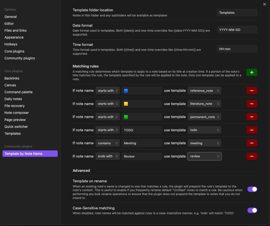 - Case sensitivity options: Choose whether or not to match note names against rules in a case-sensitive manner