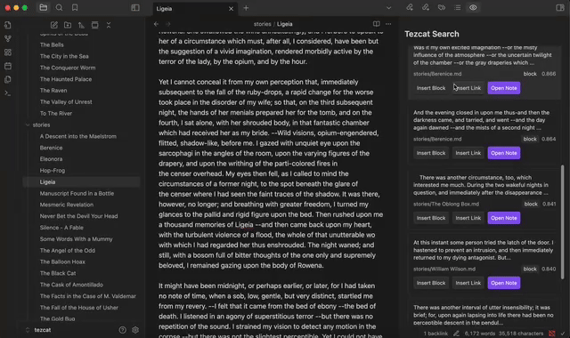 Tezcat is an Obsidian plugin that indexes your thoughts. It uses a aritificial intelligence (AI) embedding vectors to surface related content fragments and notes as you write, enhancing your creative recall in the style of a remembrance agent. Search results yield items at both a Note and a Block (section, in Obsidian) level, and you can use them to insert links to the source, insert the content itself, and open the parent page where the content comes from.