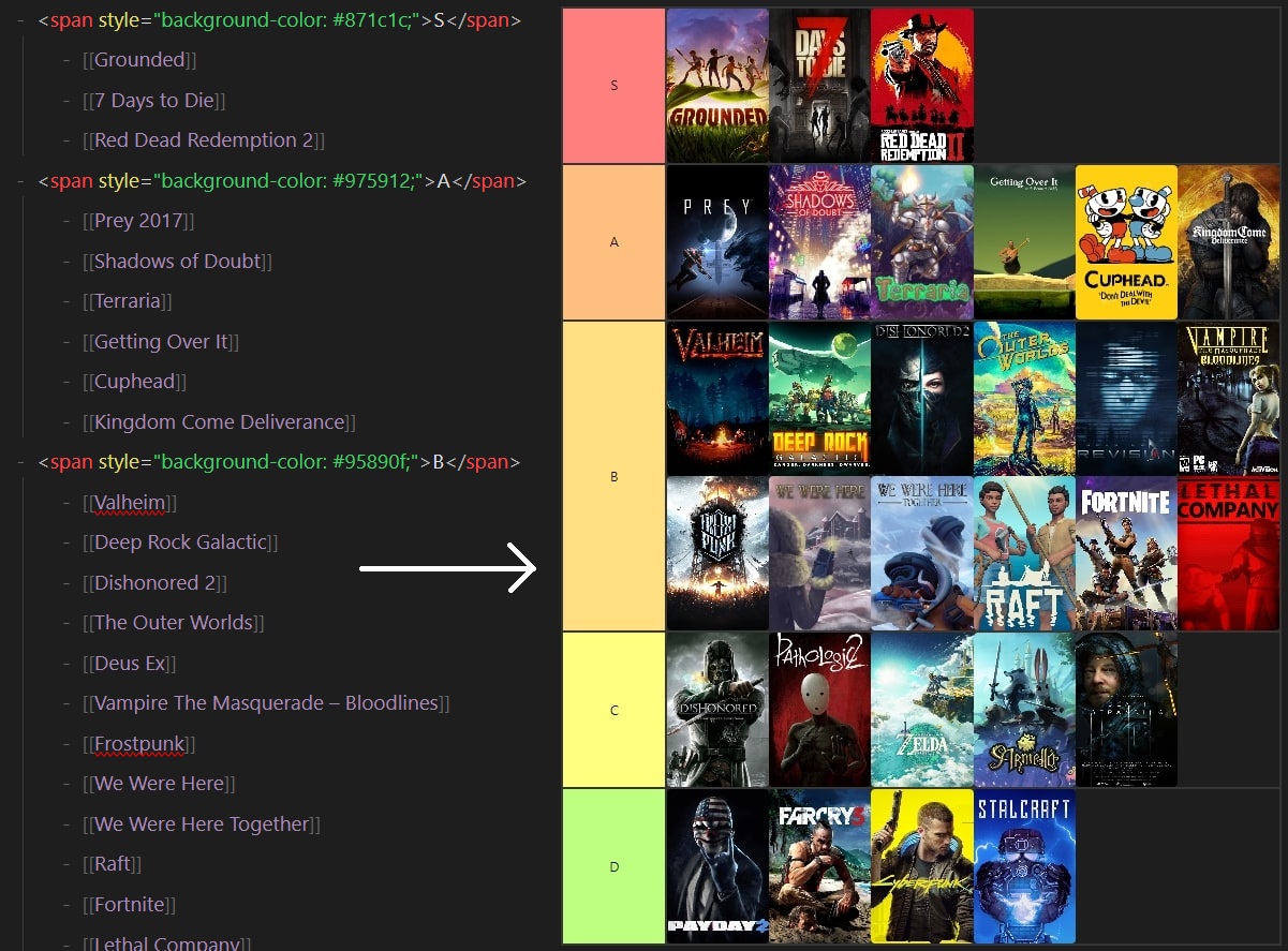 This plugin allows you to render nested lists as visual Tier Lists, providing an intuitive way to organize, rank, and display items using customizable tiers.