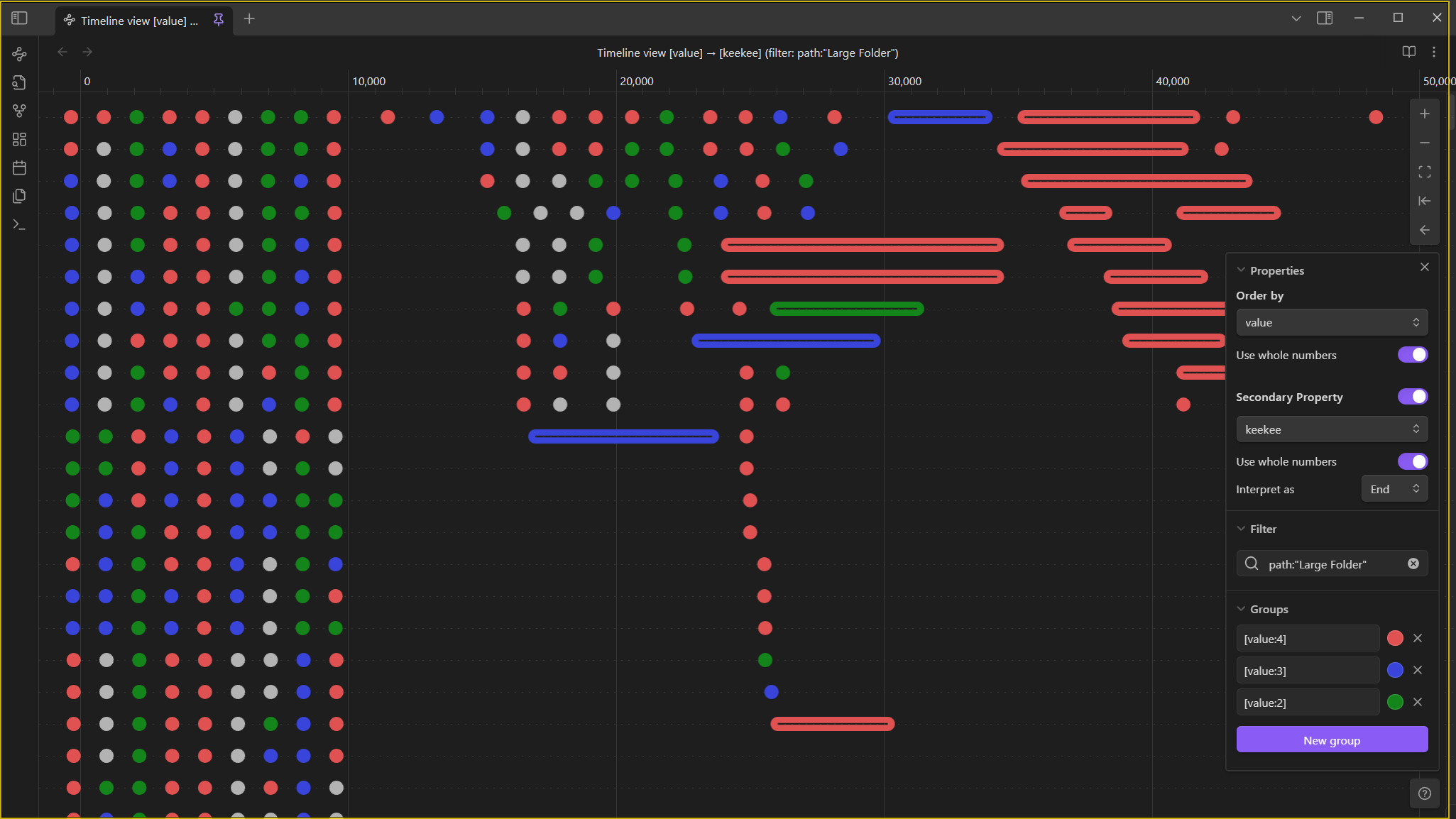 Use the same query syntax as filtering to group notes by color, similar to Obsidian's graph view. This makes it easy to visually distinguish different groups of notes on your timeline.