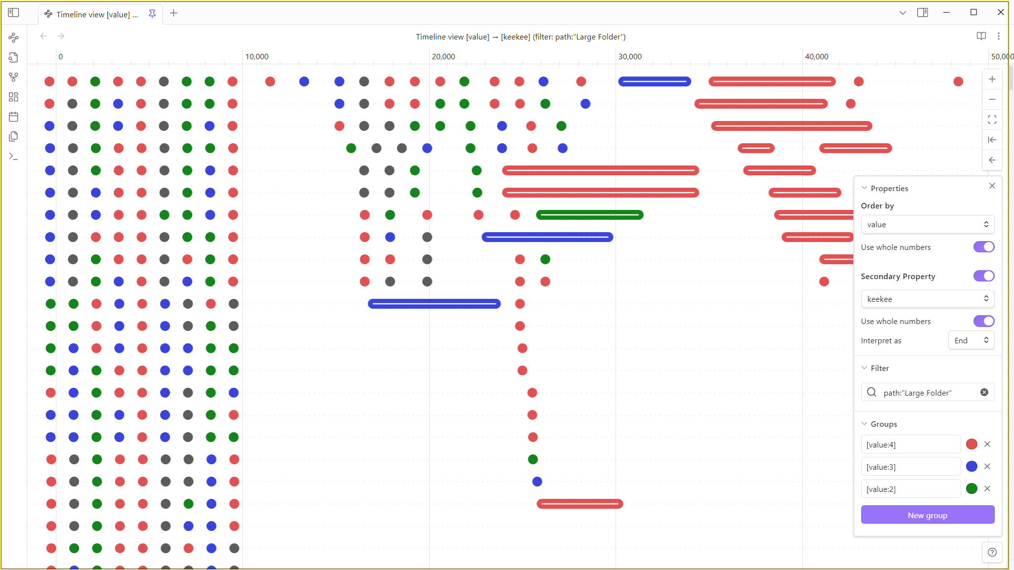 You can assign a secondary property to represent the length or end value of each note. By default, the plugin uses the note's modification time as the "end" value, but this can be customized.