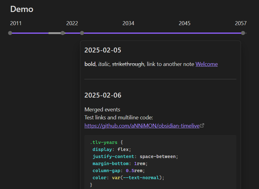 The key difference from other timeline plugins is that Timelive doesn't use a code block. It's much easier to format any date event, provide a link or block of code, add an image or a video, etc.