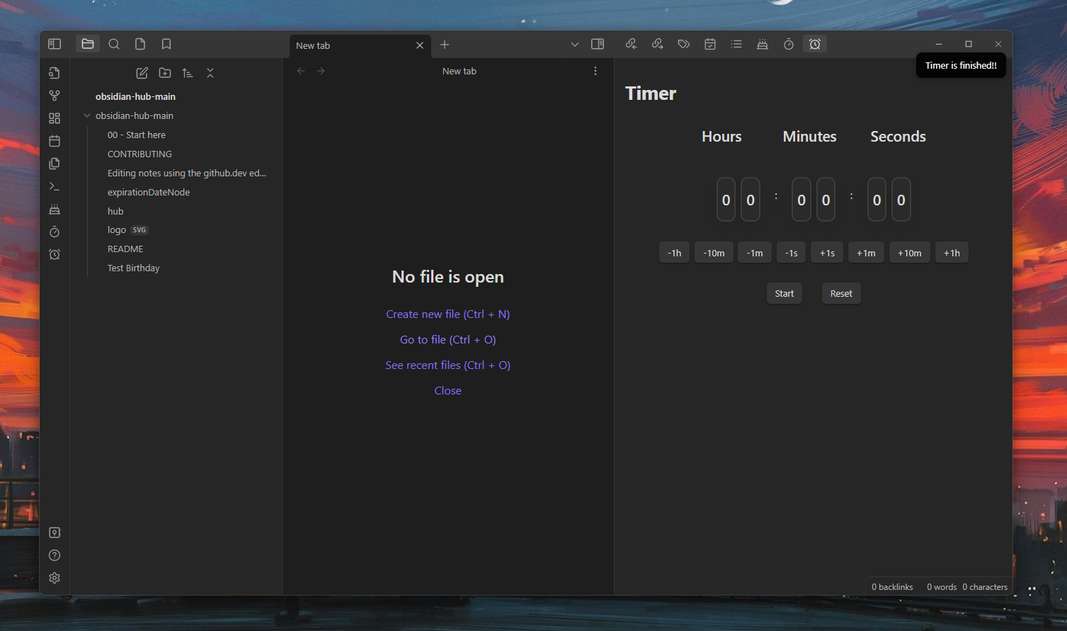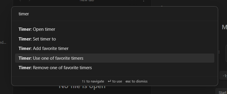 You can open the timer by clicking on the ribbon icon or using the command Timer: Open timer. You can also directly set the timer via the command Timer: Set timer to. You can use one of those two notation as input: