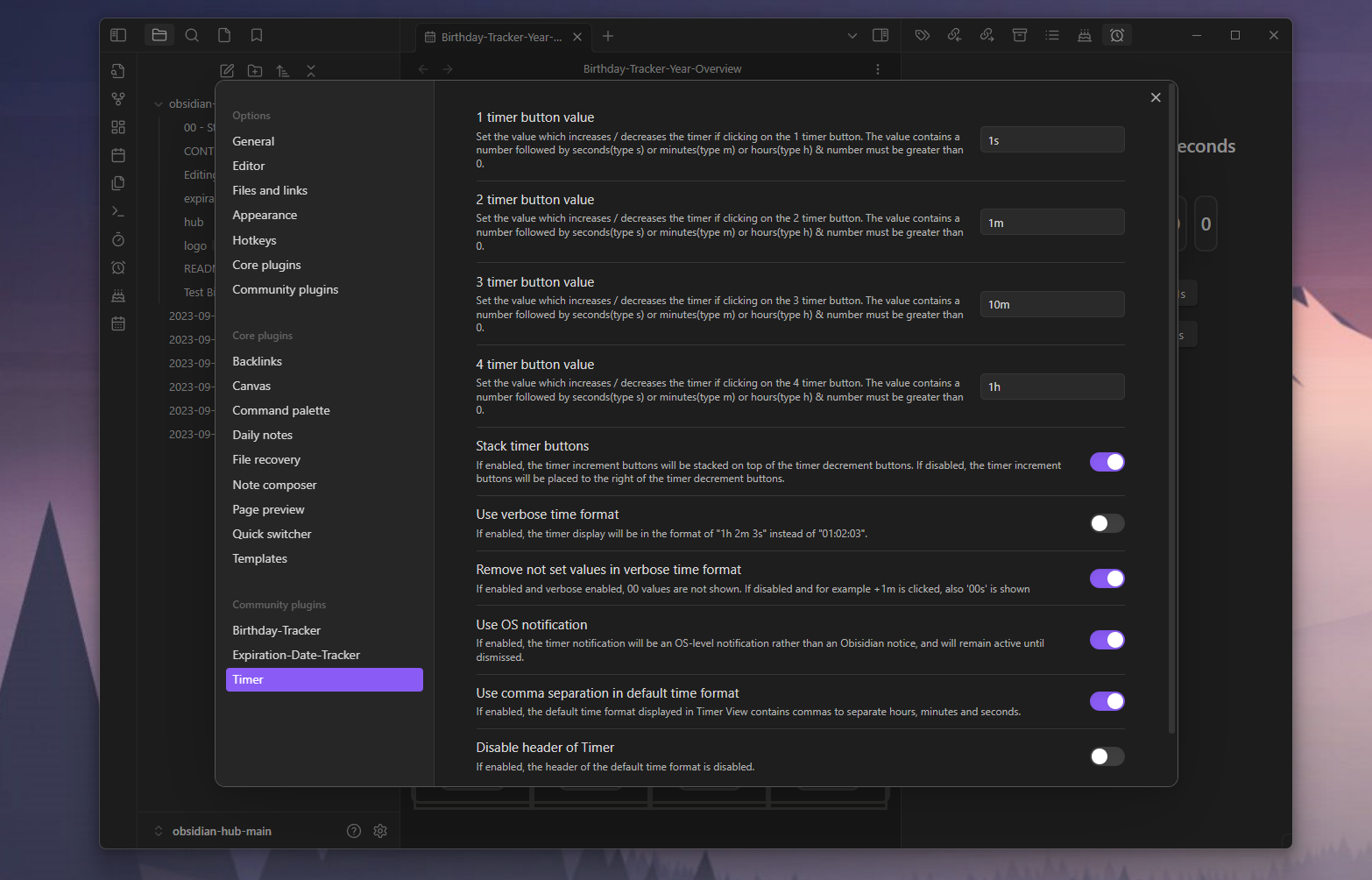 It's also possible to switch between different notifications (Obsidian/OS Notification). Deactivate commas & disable header of default timer format.