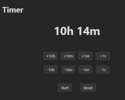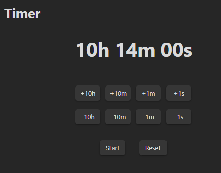 Set your timer via commands or with the timer buttons under the clock. The maximum is 99:59:59. Also if the clock is at 00:00:00 the timer is not starting. You can edit the numbers which in-/decreases the clock in the settings. If the timer is finished you get a notice. You can start/stop/cancel/resume and reset the timer. By default you can start and reset the timer, but if the timer is going you can cancel/stop/resume it.