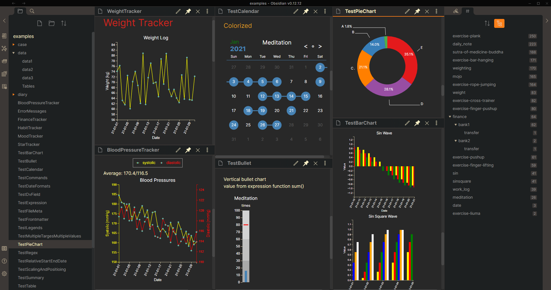 Tracker+ examples and documentation have been authored using Obsidian. Open the /sample-vault directory in Obsidian, and make sure the plugins are installed and enabled.