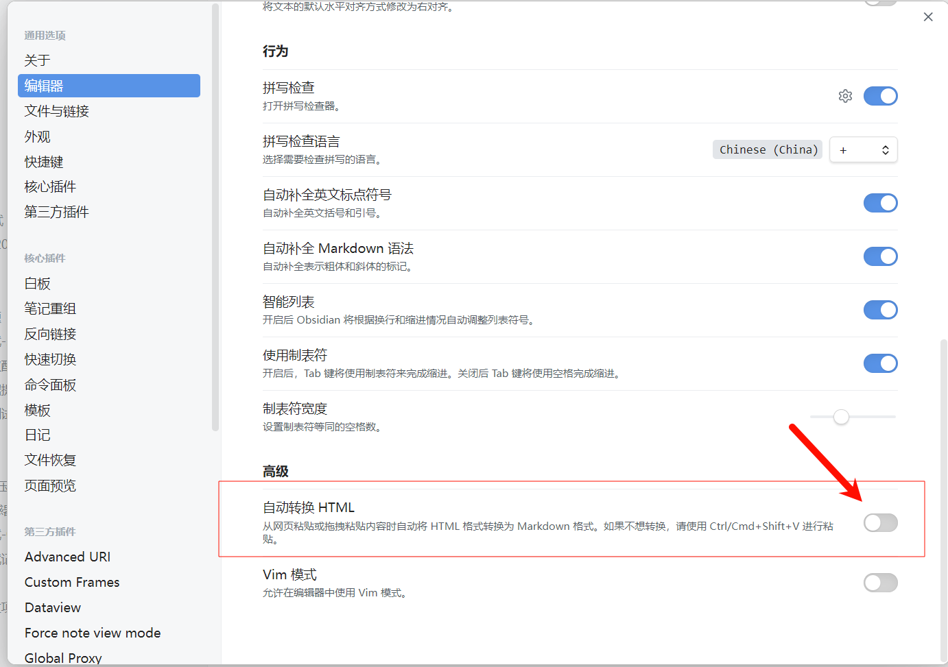 注意:使用前,请确保在Obsidian编辑器设置中关闭“自动转换HTML”选项。否则,粘贴ChatGPT的答案时,应使用纯文本格式。