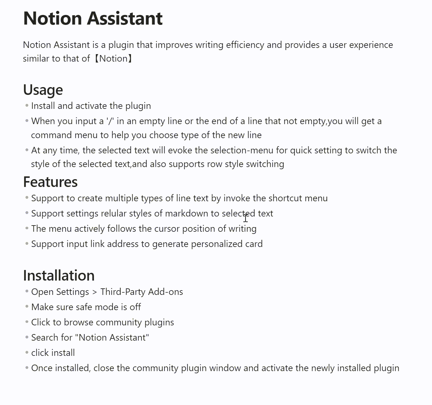 Typing Assistant is a plugin that improves writing efficiency and provides a user experience similar to that of Notion